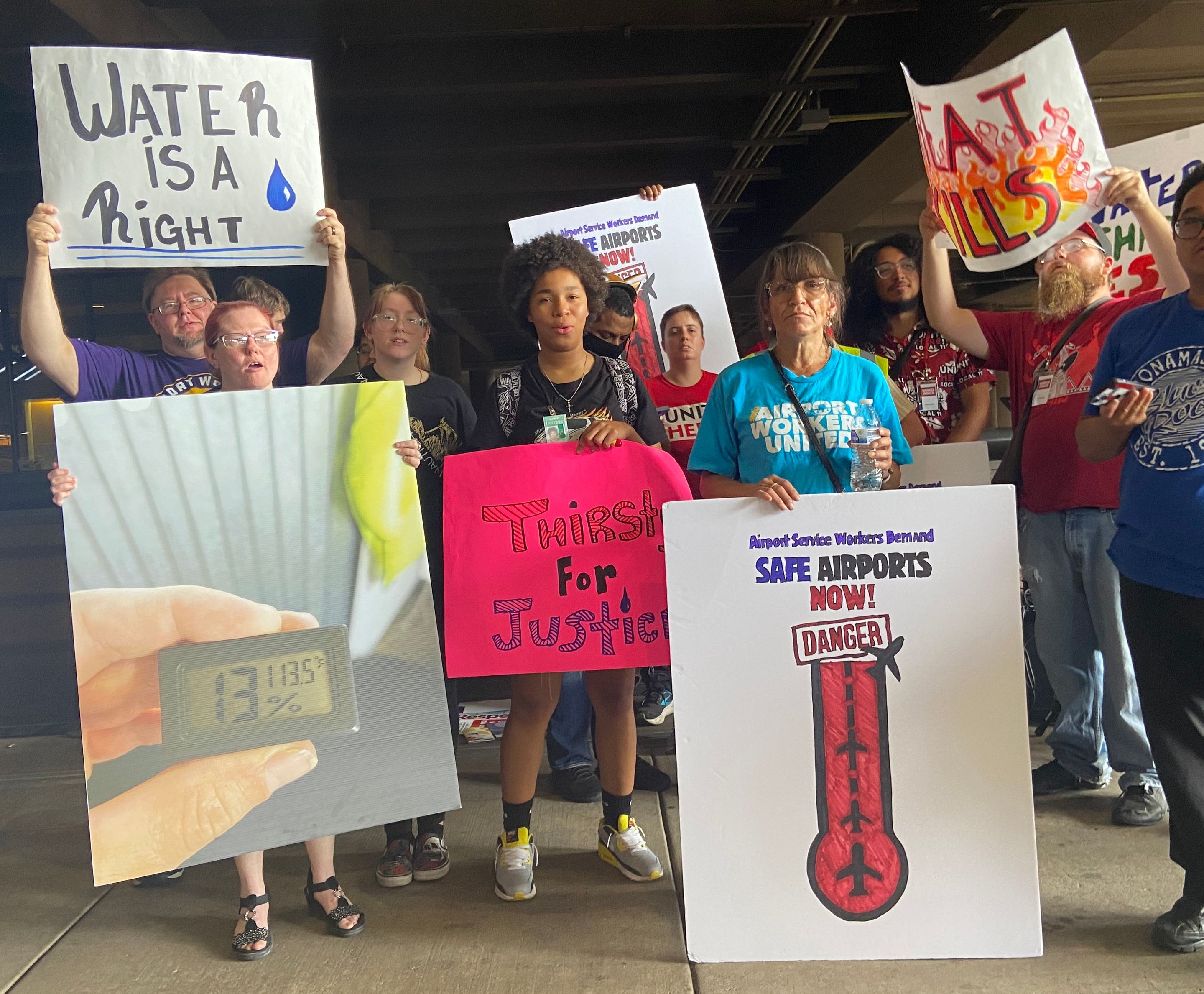Amid record-high summer temperatures, airport service workers employed by airline service providers, who airlines depend on to clean airplane cabins, handle baggage and transport passengers in wheelchairs, are demanding airlines take responsibility for their contracted service providers and ensure safe working conditions during extreme heat. Workers from across the country have been taking bold action, including leading a nationwide “Heat Week” action to raise the alarm on the dangerous heat conditions they face on the job while servicing the airlines and helping to keep planes flying and passengers safe.